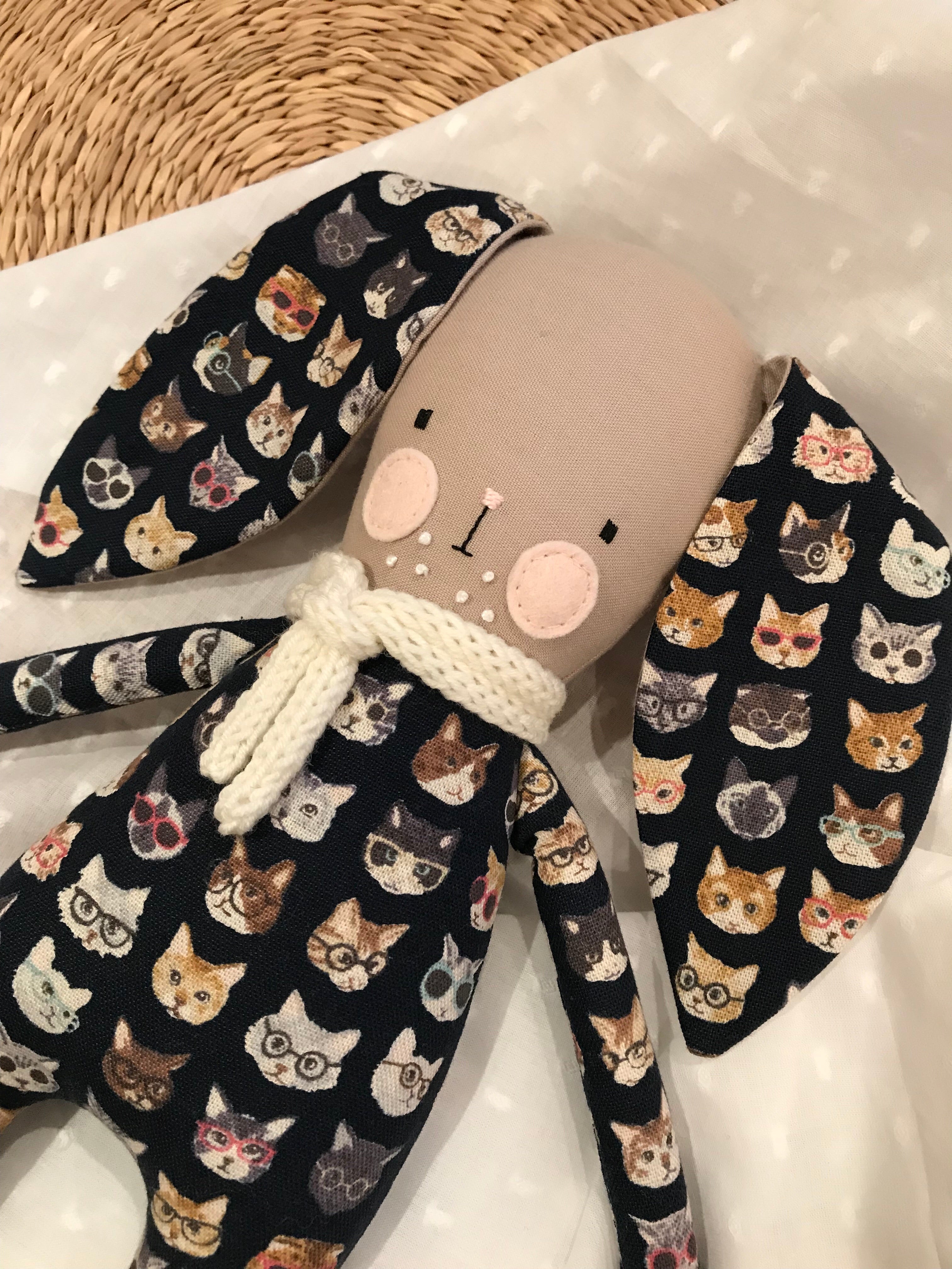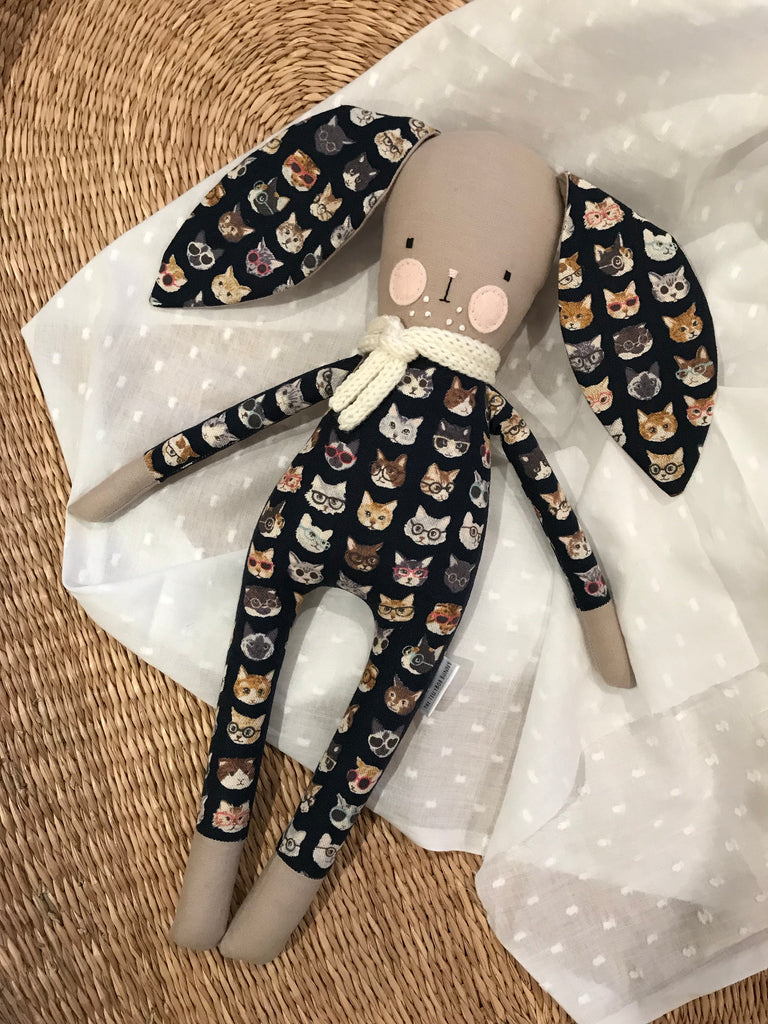 This is the original TillyBob Bunny design. The soft bodied bunny makes a perfect friend for your little one and is easy for small hands to grasp. The bunnies also make a perfect accessory for a new nursery and wonderful keepsake. Each bunny is completely handmade by Holly and unique. This fun crazy cat faces design is made of a light cotton/linen canvas. You will be purchasing the TillyBob bunny pictured here. Please note there may be slight colour differences due to lighting and screen resolution.