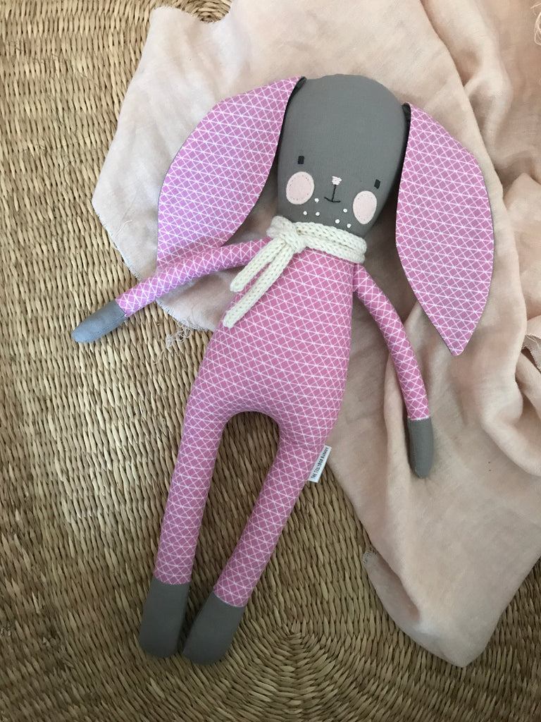 This is the original TillyBob Bunny design. The soft bodied bunny makes a perfect friend for your little one and is easy for small hands to grasp. The bunnies also make a perfect accessory for a new nursery and wonderful keepsake. Each bunny is completely handmade by Holly and unique. This beautiful pink patterned bunny is made of a really soft cotton. You will be purchasing the TillyBob bunny pictured here. Please note there may be slight colour differences due to lighting and screen resolution.