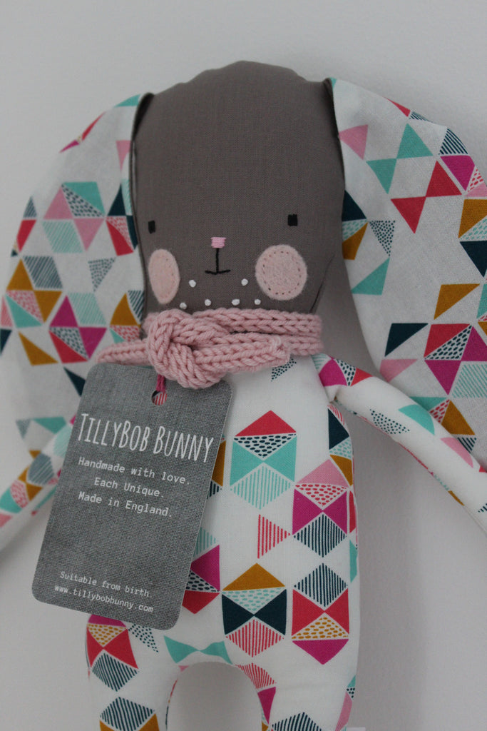 This is the original TillyBob Bunny design. The soft bodied bunny makes a perfect friend for your little one and is easy for small hands to grasp. The bunnies also make a perfect accessory for a new nursery and wonderful keepsake. Each bunny is completely handmade by Holly and unique. This lovely multi colour geometric fabric is 100% cotton and beautifully soft. You will be purchasing the actual TillyBob bunny pictured here. Please note there may be slight colour differences due to lighting and screen resolution.