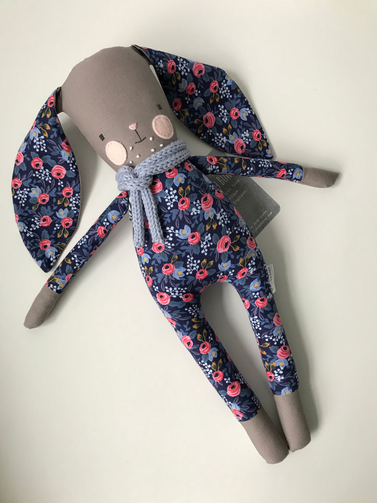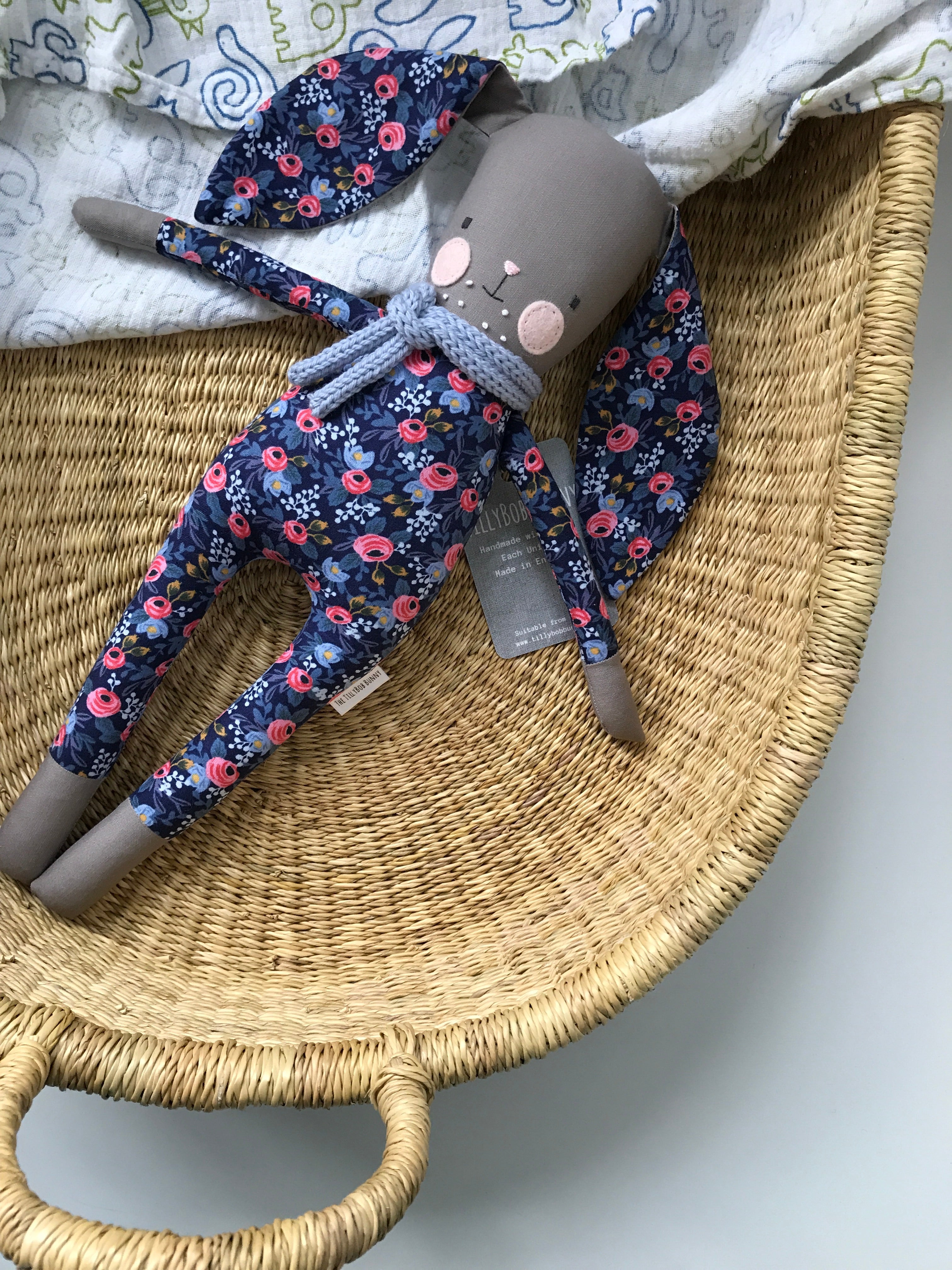 This is the original TillyBob Bunny design. The soft bodied bunny makes a perfect friend for your little one and is easy for small hands to grasp. The bunnies also make a perfect accessory for a new nursery and wonderful keepsake. Each bunny is completely handmade by Holly and unique. This beautiful navy floral design is lovely and soft, the bunny is also wearing a super snuggly blue scarf! You will be purchasing the TillyBob bunny pictured here. Please note there may be slight colour differences due to lighting and screen resolution.