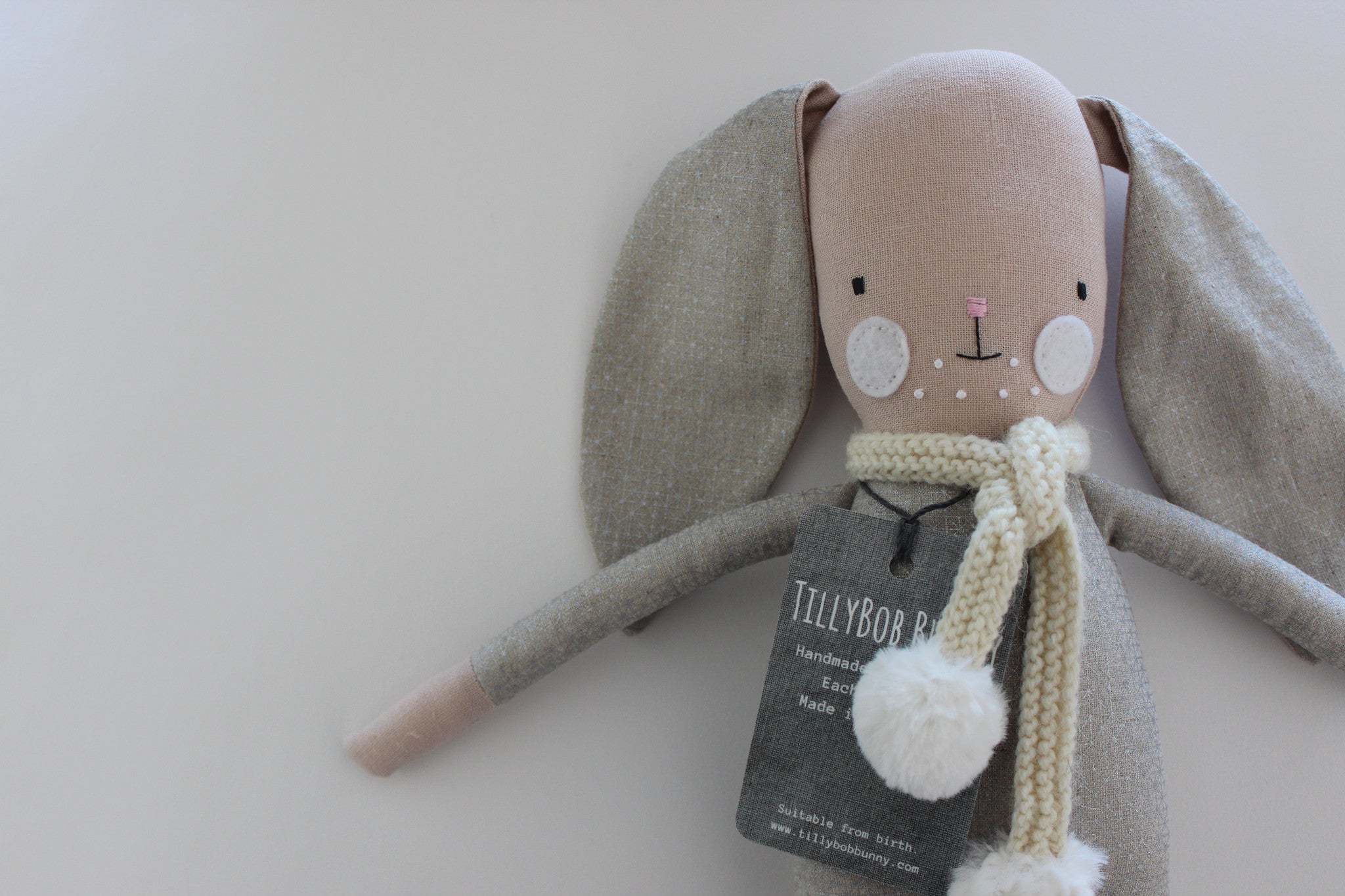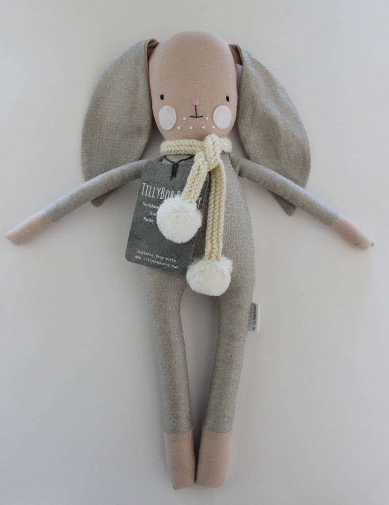 This is the original TillyBob Bunny design. The soft bodied bunny makes a perfect friend for your little one and is easy for small hands to grasp. The bunnies also make a perfect accessory for a new nursery and wonderful keepsake.  Each bunny is completely handmade by Holly and unique. This beautiful is made of a cotton/linen mix with a hint of lovely sparkle! She is also wearing a super snuggly wool scarf with pom pom trim. You will be purchasing the TillyBob bunny pictured here. Please note there may be slight colour differences due to lighting and screen resolution.