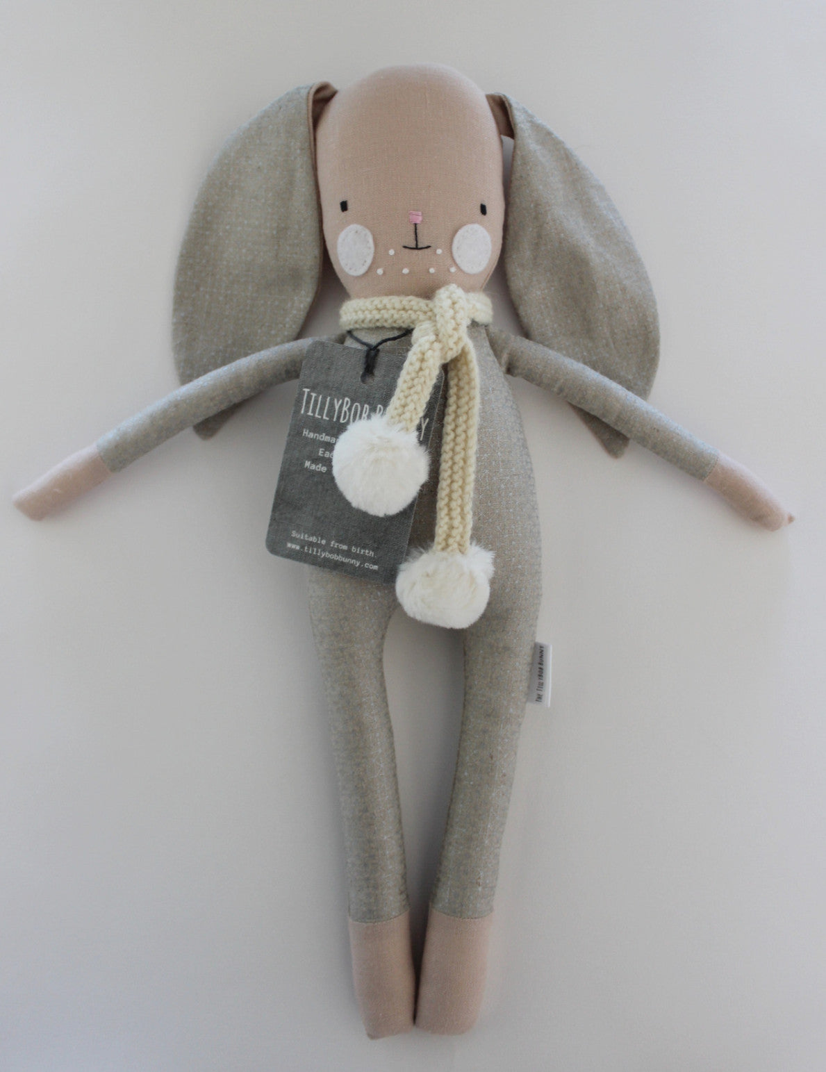 All our TillyBob Bunnies are CE marked and suitable from birth. They all come packaged in their own hand-stamped cotton bag*, perfect to give as a gift.