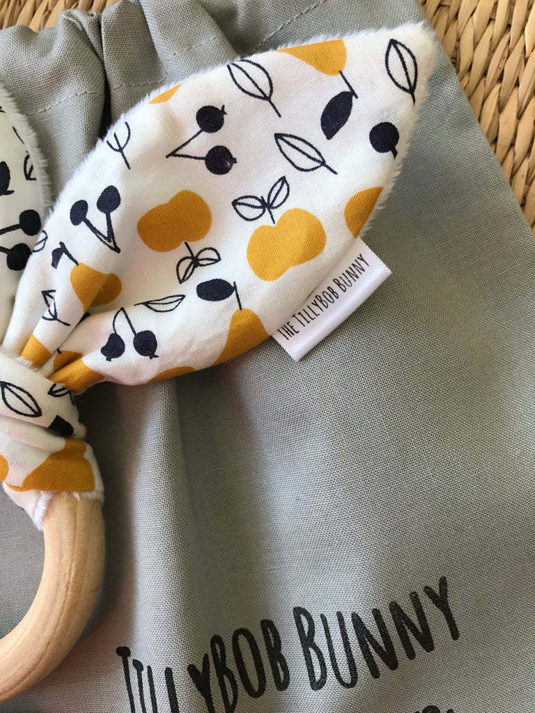 This natural untreated maple hardwood teething ring is perfect to sooth the gums of your little one and perfect for little hands to grasp. Attached are a pair of TillyBob Bunny ears backed with a super soft plush fabric.
