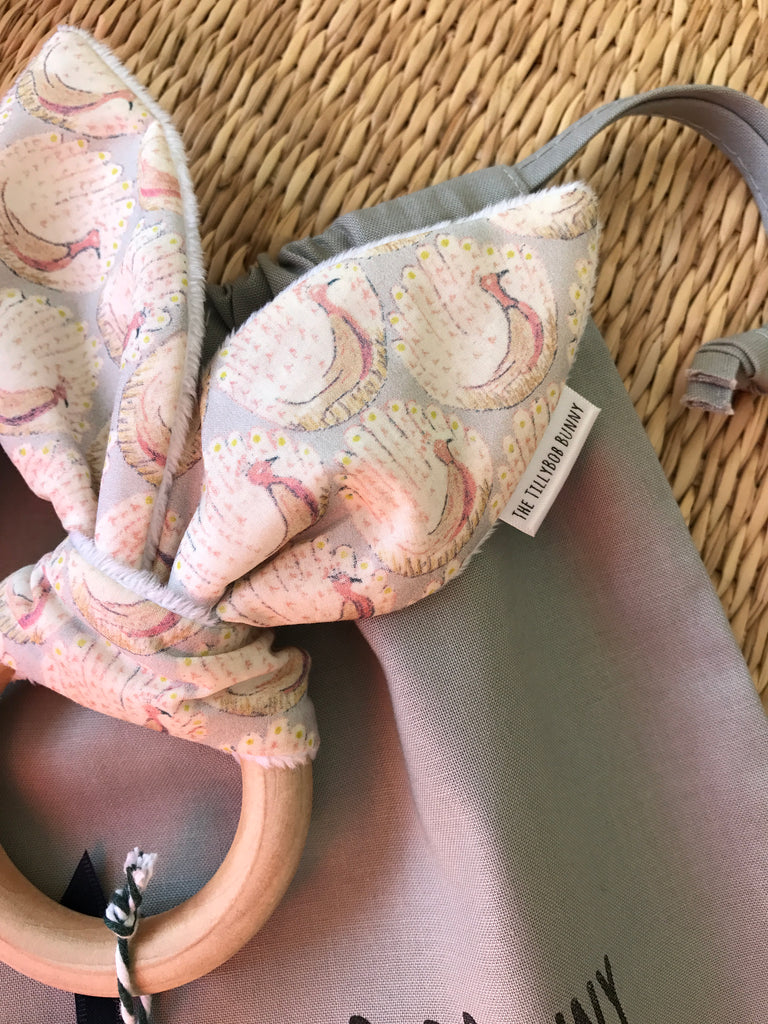 This natural untreated maple hardwood teething ring is perfect to sooth the gums of your little one and perfect for little hands to grasp. Attached are a pair of TillyBob Bunny ears featuring Liberty Tana Cotton and backed with a super soft plush fabric.