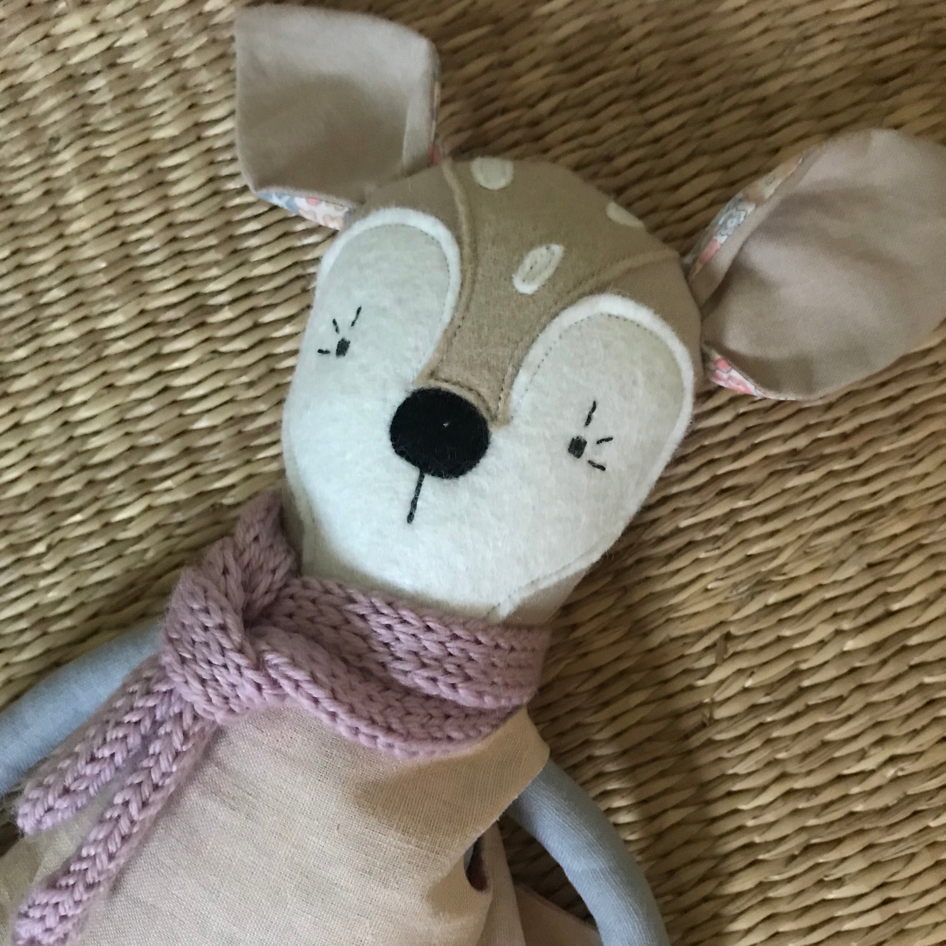 This is one of the TillyBob Bunny Friend designs. This little Fawn is sweet and gentle! The soft bodied toy makes a perfect friend for your little one and is easy for small hands to grasp. Philly also makes a perfect accessory for a new nursery and wonderful keepsake. Each TillyBob Friend is completely handmade by Holly and unique. This Fawn comes complete with her own reversible dress made using linen and Michelle Liberty Lawn, she is absolutely unique, she also has a beautifully soft lambs wool scarf to keep her cosy! You will be purchasing the Fawn pictured here. Please note there may be slight colour differences due to lighting and screen resolution.